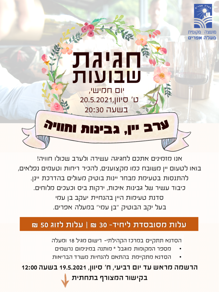 🌾 חגיגת שבועות 🌾 🍷 ערב יין, גבינות וחוויה🍷 יום חמישי, ט' סיוון, 20.5.2021 בשעה 20:30 במרכז הקהילתי הרשמה מראש עד יום רביעי, ח' סיוון, 19.5.2021 בשעה 12:00